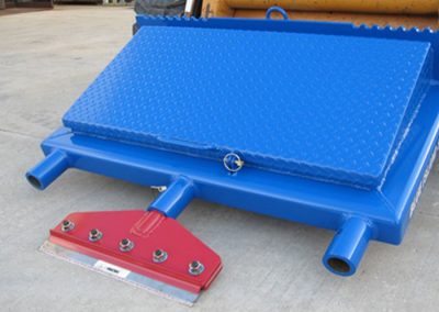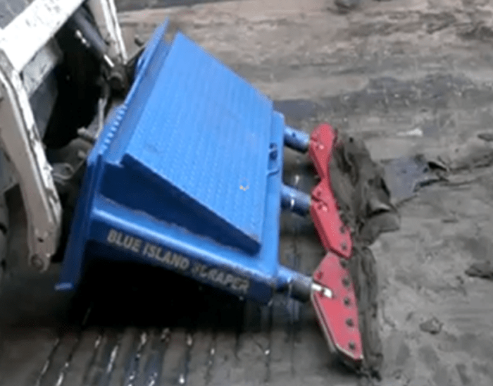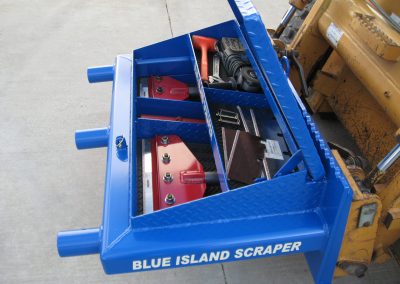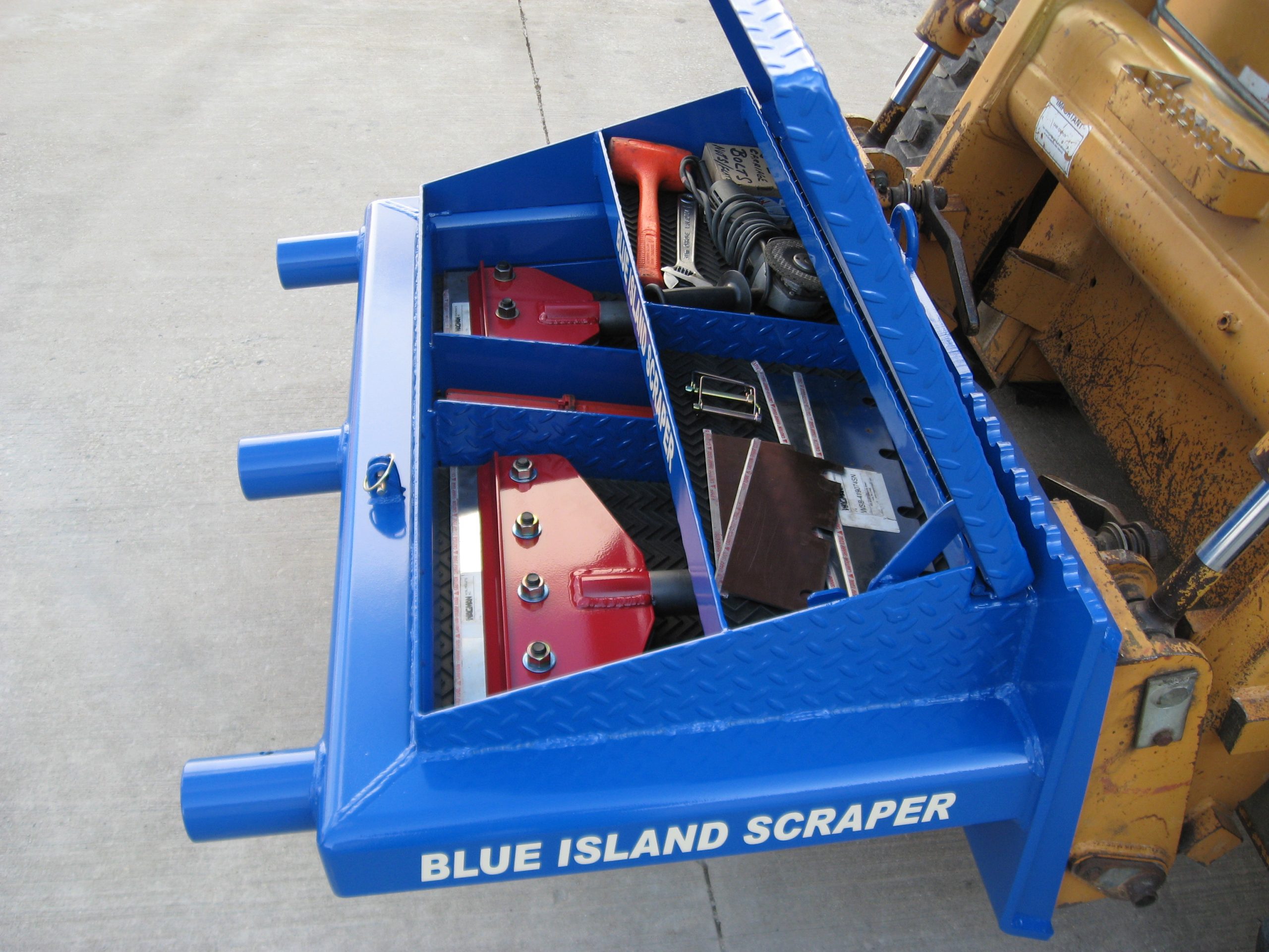 The Mini Blue Island Scraper universal floor scraping attachment can handle your toughest flooring removal jobs. This scraper has a revolutionary floating head allowing it to follow the contour of the floor for maximum product removal. It can remove vct tile, carpeting, rubber products, epoxy, etc. with ease. The Blue Island Scraper can use a single scraper head for tough conditions or all 3 (additional heads sold separately) for a maximum width of 57” for flooring that is easily removed. Quick change tool holders make changing from scrapers to chisels easy. The scraper also has a built in lockable tool carrier to minimize loss of parts. This is a must have attachment for anyone doing large flooring removal projects and has a mini skid steer.